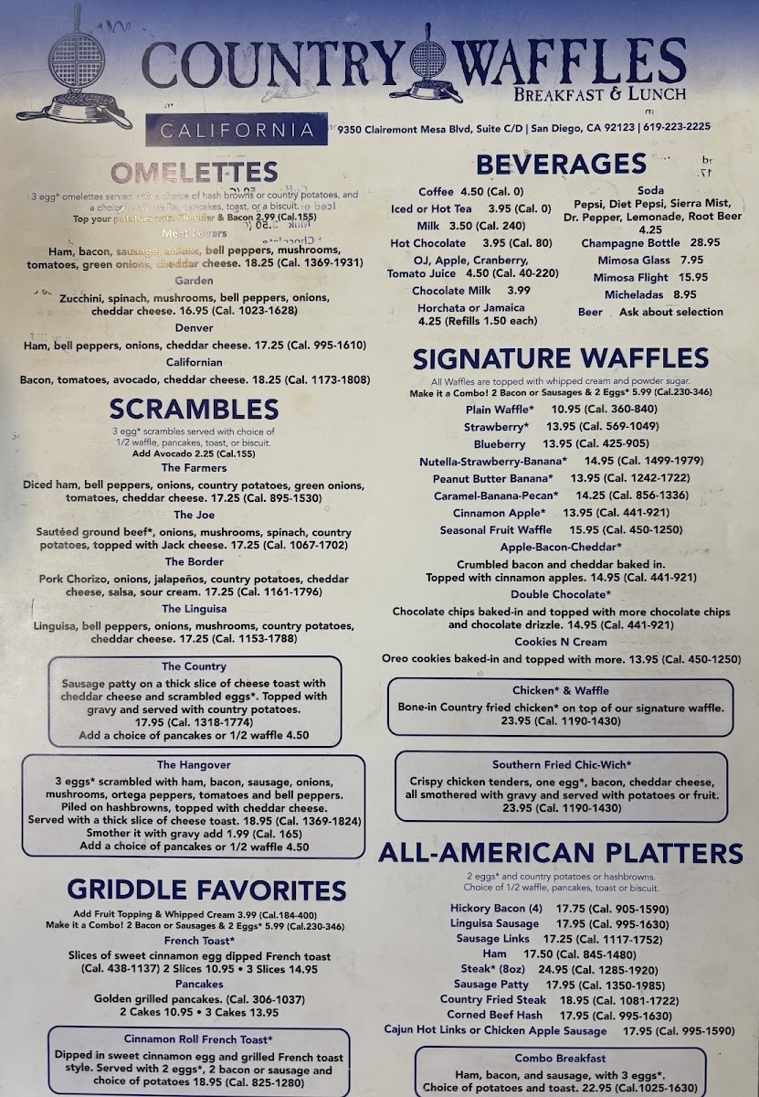 Cal. 825-1280. Served with 2 eggs, 2 bacon or sausage, and country potatoes.
