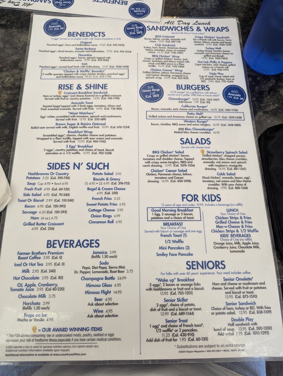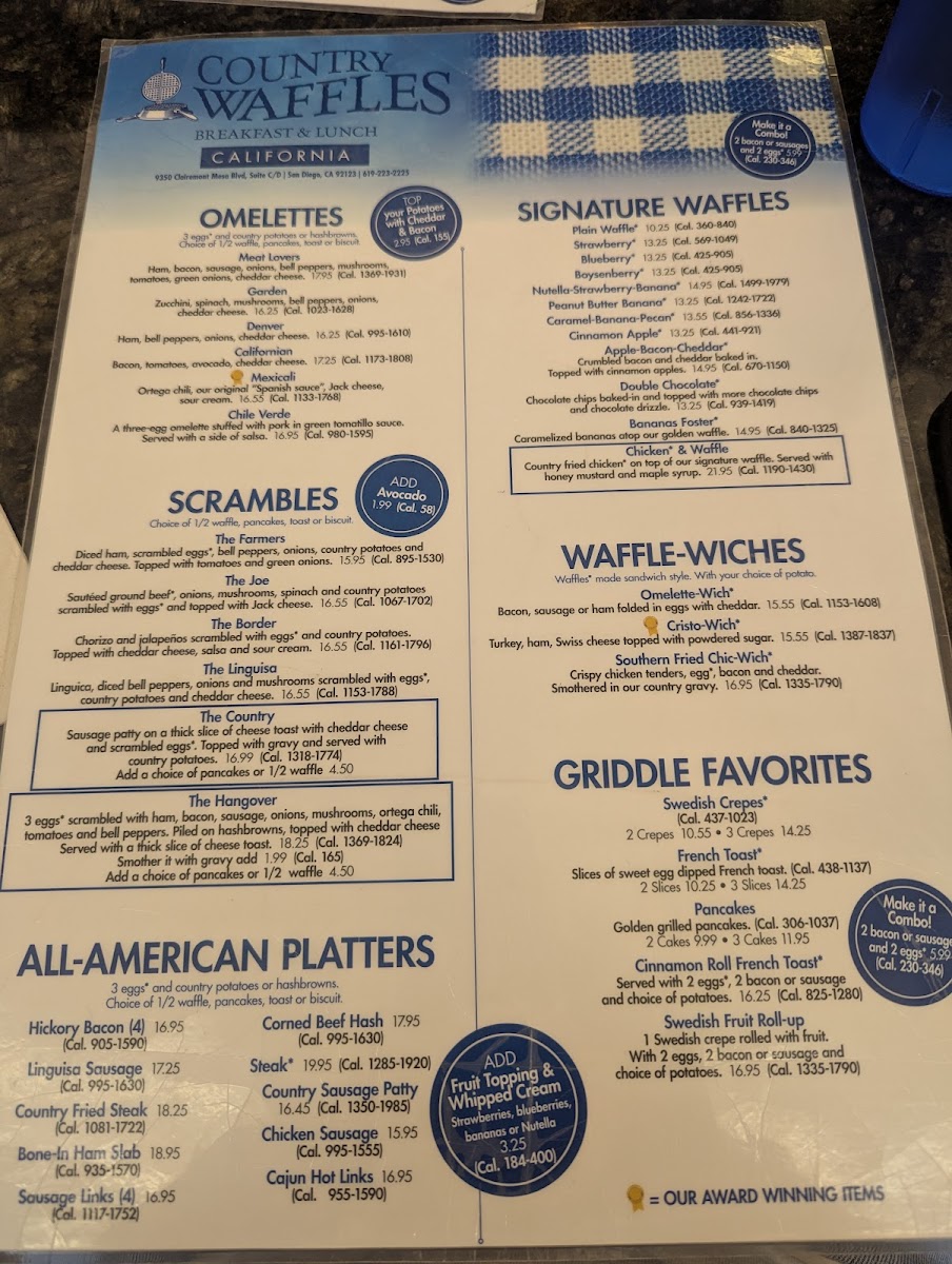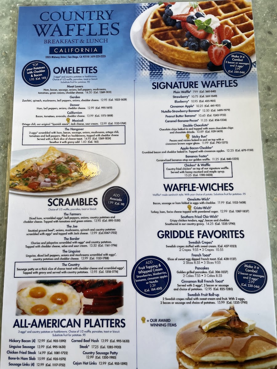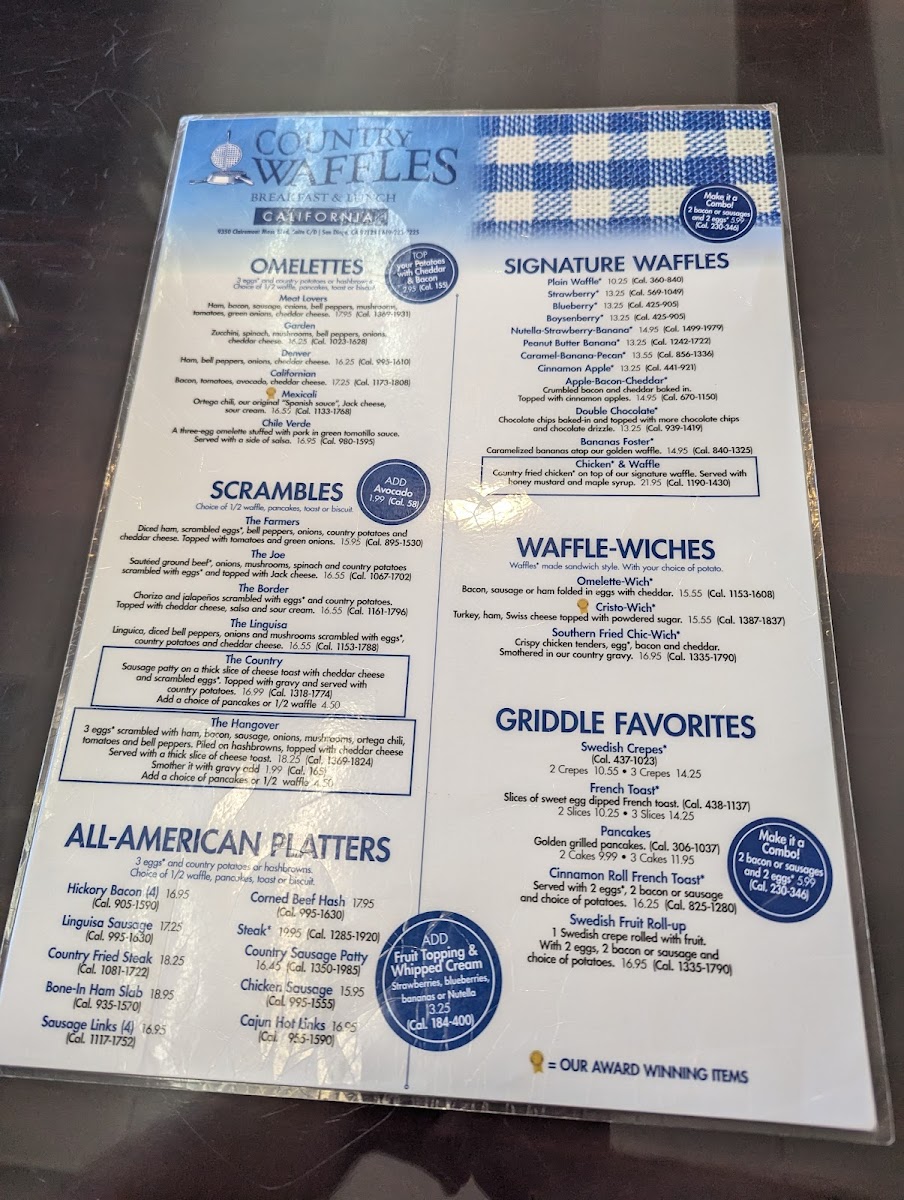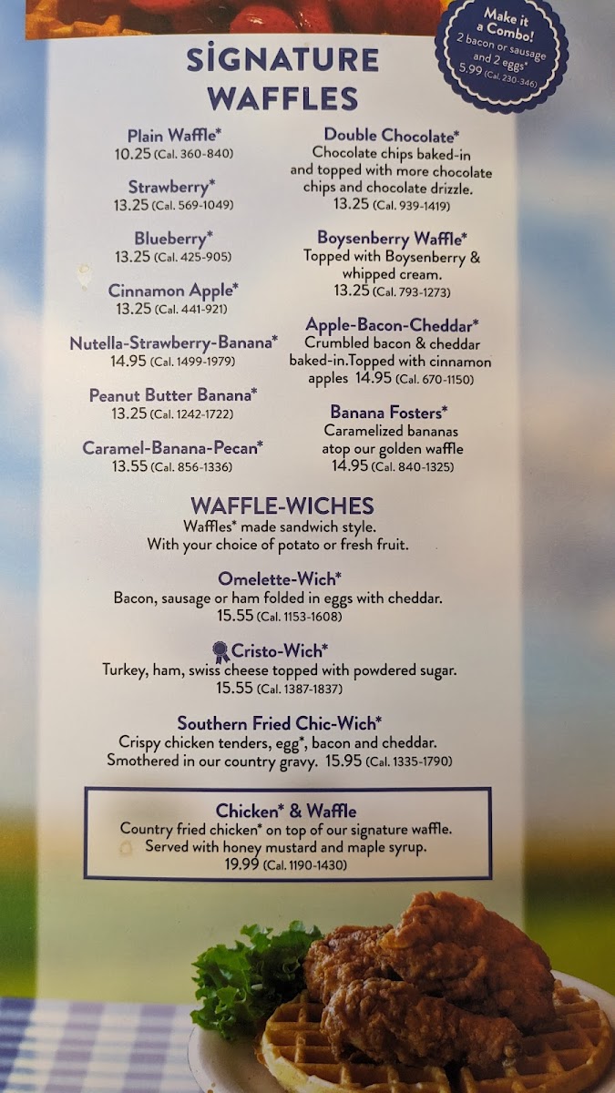 Cal. 1190-1430. Country fried chicken on top of our signature waffle. Served with honey mustard and maple syrup.