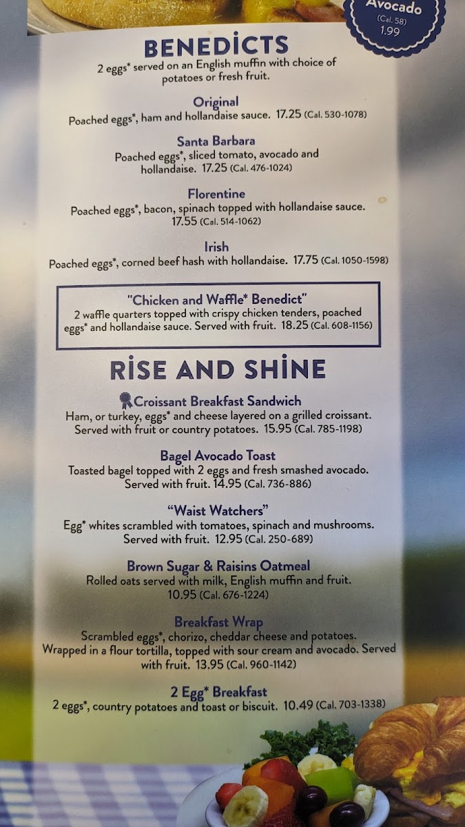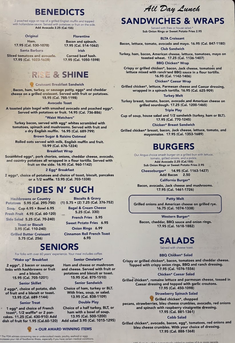 Cal. 785-1198. Our award-winning items. Ham, or turkey, eggs, and cheese layered on a grilled croissant. Served with fruit or country potatoes.