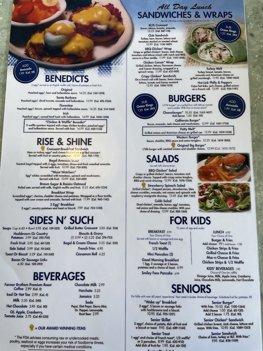 Cal. 1285-1920. 8 Oz steak, cooked your way, with 3 fresh eggs, potatoes, and choice of bread, biscuit, pancakes, or a 1/2 waffle
