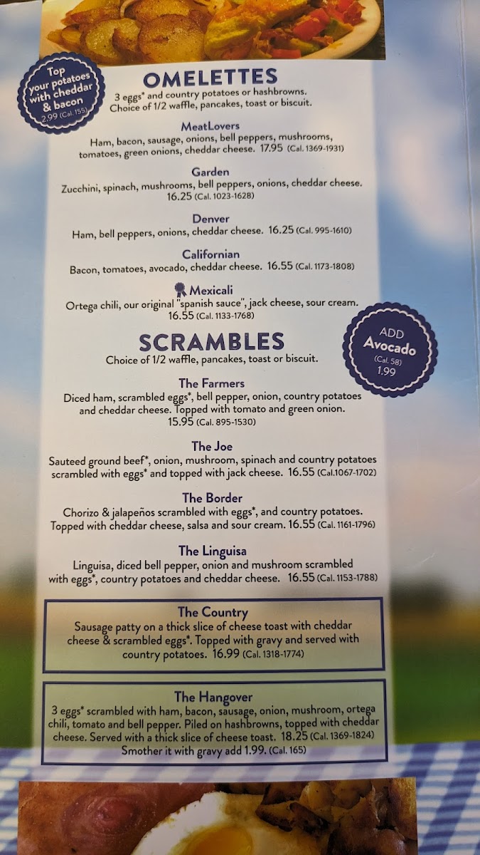 Cal. 1369-1824. 3 eggs scrambled with ham, bacon, sausage, onion, mushroom, Ortega chili, tomato, and bell pepper. Piled on hash browns, topped with cheddar cheese. Smother it with gravy (Cal.165) for an additional charge.